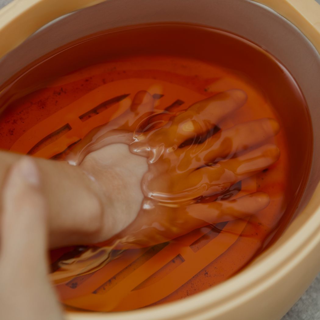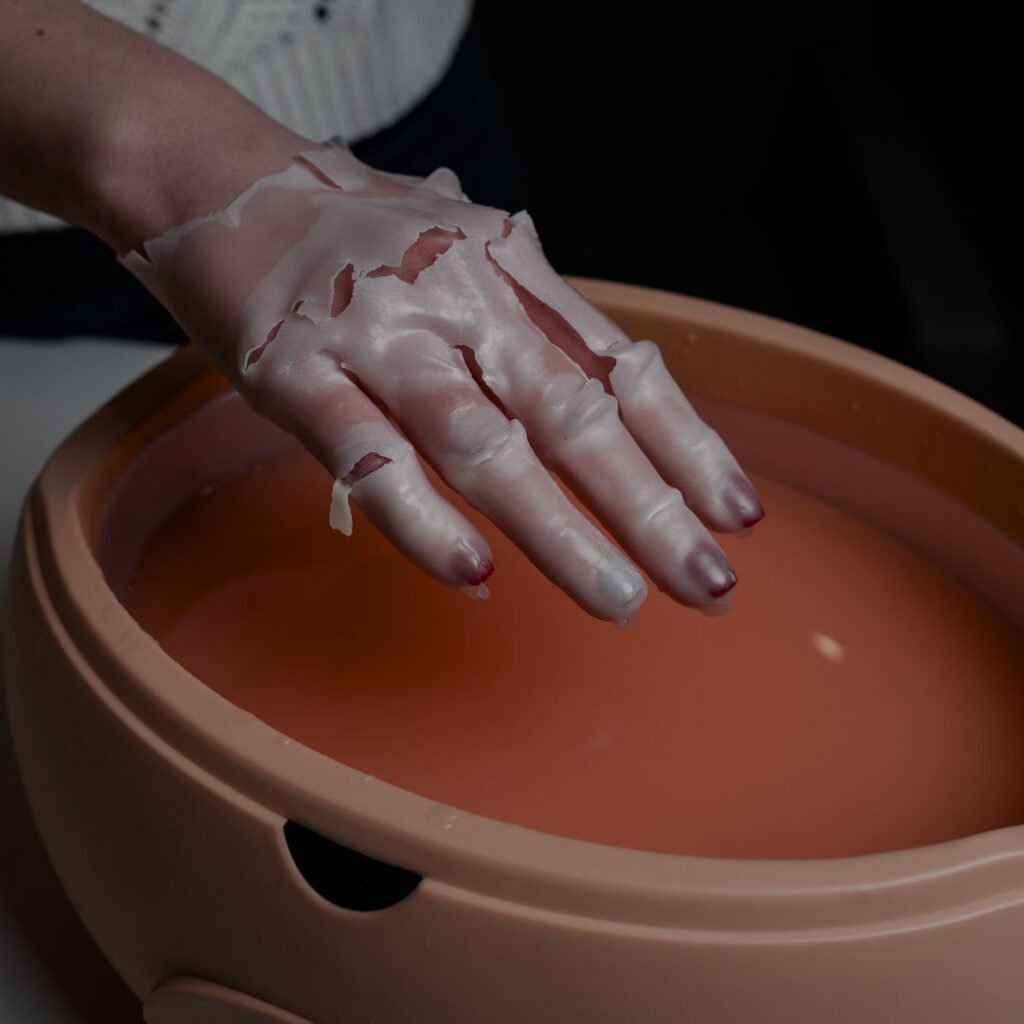Nach der Reinigung werden deine Hände mehrfach in warmes Paraffin getaucht. Anschließend wirkt das Wachs einige Minuten ein, bevor es sanft entfernt wird.